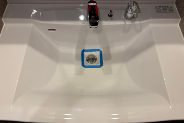 施工後は、排水口からの害虫侵入や臭いの発生を防ぐため、ラップとマスキングを用いた養生を徹底しています。